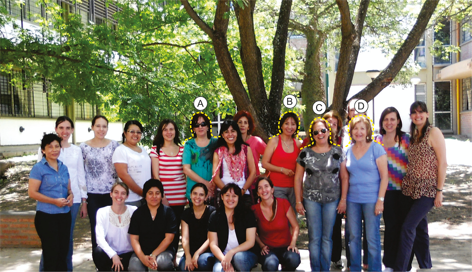 Fig. 2. Docentes y estudiantes del Curso de Posgrado de la Facultad de Ciencias Naturales, Doctorado en Ciencias Biológicas de la Universidad Nacional de Salta (octubre 2013). A. Lilia Mautino; B. Olga Martínez; C. Silvina Garralla y D. Luisa Anzótegui.
