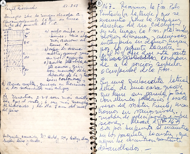 Fig. 3. A. Fotografía de una página de su primera libreta de campo. En ella se puede leer lo siguiente: “Perfil Riachuelo - 17-8-68; Tomado sobre la margen derecha a aproximadamente 1,5 km en línea recta del puente del F. C. (Ferrocarril)”. a) suelo arriba + o - húmico, hacia abajo más arenoso en transic. (transición) a; b) capa de arena suelta, grano grueso sin mat. (materia orgánica); c) arcilla plástica en pte (pendiente) arenosa, gris con manchas de hidróxido de Fe y también carbonosas; d) arenas sueltas, gruesas en transición a los sedimentos más antiguos. Obs (observaciones) muestras 2-3-4 son más arcillosas que el resto; 6 con más manchas de hidróxido; la 11 a 8 cm del nivel del piso. Integrantes excursión. Dr. Herbst y Sra., Beatriz Álvarez, Mercedes Leiva y Castro”. B. Fragmento de sus anotaciones realizadas durante un viaje de campaña a la Provincia de Salta, localidad fosilífera Rincón Quebrada del Horno, el día 4-5-87: “...167 - Recorrimos la Fm. Palo Pintado (a la tarde) que se encuentra sobre la margen derecha del río Calchaquí, en este lugar la Fm. pta (presenta) muchos bloques de arena y areniscas interrumpidos en algunos lugares por los paquetes lacustres. El Dr. (así se refería al Dr. Herbst) dice que esta parte corresponde a la porción cuspidal de la Fm. En una quebradita lateral detrás de una casa grande que tiene sus paredes pintadas con elementos folclóricos y escritos versos del Martín Fierro, encontramos en varios niveles moldes de pelecípodos e impresiones. Llevan el N° 167. Esto por supuesto se encuentra en los paquetes lacustres, que aquí se encuentran bastante desarrollados”.