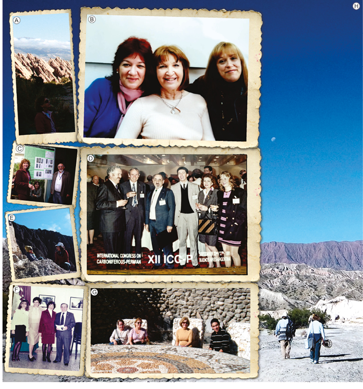 Fig. 4. Fotos tomadas en viajes de campo y en reuniones científicas. A. Luisa escudriñando los afloramientos de la Formación Palo Pintado (Salta, año 2011). B. De izquierda a derecha, Lilia Mautino, Luisa Anzótegui y Silvina Garralla. C. Luisa Anzótegui junto al Dr. Rafael Herbst, en un congreso en Gramado, Brasil, sentada en el medio de ambos, la colega brasileña, Maria Luisa Lorscheitter (año 2004). D. De izquierda a derecha, Lorenzo Ferrando, Eduardo Llambias, Rafael Herbst, Oscar Gallego, Luisa Anzótegui y Alicia Lutz. E. Luisa junto a su colega Olga Martínez (Localidad Quebrada del Toro, Salta, año 2012). F. Graciela Cuadrado, Stella Maris Pire y Luisa Anzótegui junto a quien fuera el Decano de la FaCENA, Dr. Ángel Fusco, en la presentación del primer Volumen de la Flora Polínica del Nordeste Argentino. G. De izquierda a derecha, Susana Morton, Silvina Garralla, Luisa Anzótegui y Manuel Robledo (becario doctoral de Yuyi en ese entonces), visitando el Museo “Pachamama”, en Amaicha del Valle, Tucumán, en el año 2011. H. Luisa Anzótegui (derecha) y Susana Morton, volviendo de una larga jornada en el campo. De fondo se yerguen majestuosas, las coloridas formaciones Cenozoicas, tantas veces visitadas por Yuyi y su grupo de investigación; lugares donde forjamos inolvidables recuerdos y a donde siempre queremos volver (Localidad Santa Rosa, Salta, año 2012).