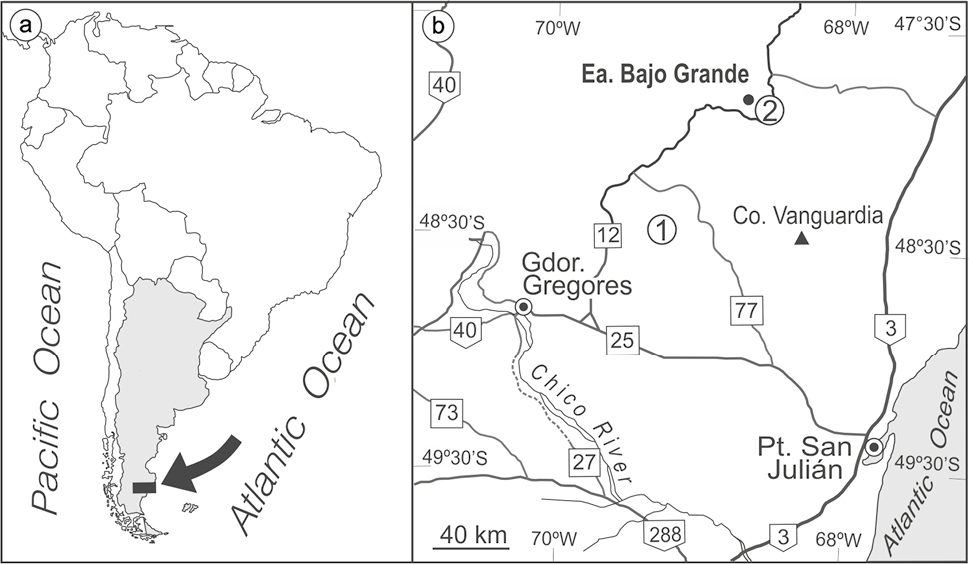 Figure 1. a. Location map of the studied area in the Deseado Massif Basin (black rectangle). b. Detail of the area showing outcrops of Baqueró Group (gray) (based on the geological survey of Panza et al., 1998). 1, Anfiteatro de Ticó locality; 2, Cerro Bayo locality.