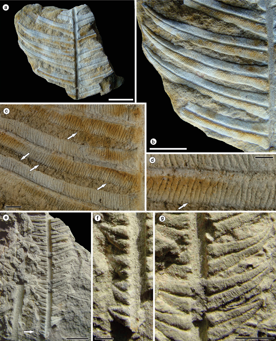 Description. The description is based on all available specimens, which are referred to the same taxonomic entity due to their overall similarity in general morphology, pinnule size and shape, and venation pattern. Complete leaves and fertile leaves are unknown. Pinnate leaf fragments, up to 6.2 cm long, 6.4 cm wide (Fig. 2a, e). The rachis is straight and stout, 1.1–2 mm wide, being widest at the basal sections and non-grooved (Fig. 2a, b, e, f). Pinnule attachment ranges from opposite to alternate (Fig. 2a, e). Pinnules variable in shape and size. The basalmost preserved pinnule 2.9 mm long and 2.8 mm wide at its base, with an l/w ratio c.1. It is triangular in shape and attached at angle of 67° (Fig. 2e, f). Pinnule morphology changes abruptly towards the apex of the pinna, becoming linear to slightly falcate (Fig. 2a–c, e–g), gently curving towards the apex. The longest pinnules reach up to 33 mm in lenght, 6.7 mm at their base, with an l/w ratio c. 5. Attachment angles range from 67 to 79°. The margins are entire, abaxially curved (coriaceous?), and the basal region is straight in the basalmost pinnules, becoming acroscopically and basiscopically decurrent towards the apex (Fig. 2a–c, e–g). Pinnule apices are acute (Fig. 2a, b, e, g). Pinnule venation consists of a midvein and numerous lateral veins. The midvein is straight to slightly recurved, ending just below the pinnules apex. Lateral venation with a density of 48–53 veins per cm at the margin (Fig. 2b–d). Lateral veins fork once to four times; with dichotomies occurring immediately after their departure from the midvein or extending across all the length of the lamina. Some lateral veins rejoin with adjacent ones, forming irregularly distributed, discrete areoles (Fig. 2b–d). Lateral veins diverge from the midvein at angles of 64–88° and reach the margin of the pinnule (Fig. 2c-d). The lateral veins are alternate to opposite (Fig. 2b–d). The dissection pattern of the venation remains unknown. Interveinlet interval 0.18–0.26 mm (Fig. 2c-d).