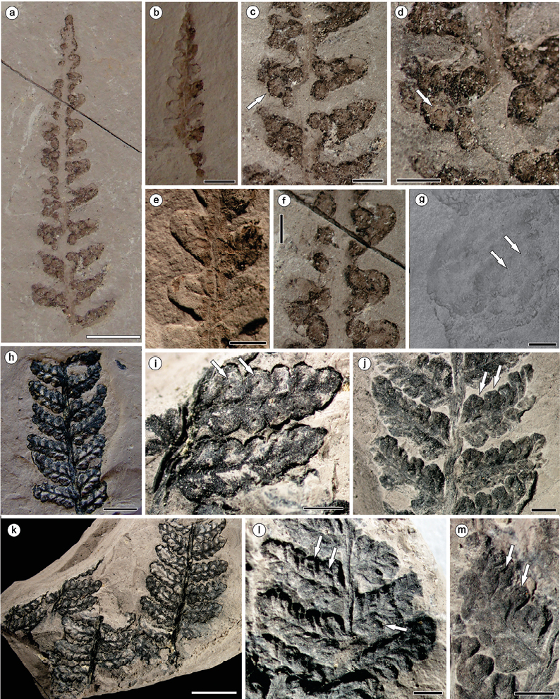 Description. The description is based on six fragmentary specimens originally coming from a single rock sample, which are referred to the same taxonomic entity due to their general morphological similarity, pinnule size and shape, and venation pattern. Complete leaves are unknown. Pinnate leaf fragments (Fig. 3h, j–l), possibly at least bipinnate (see MPMPB 3236 B, Fig. 3k), up to 16 mm long and 9 mm wide. The rachis is straight to flexuous, 0.3–0.4 mm wide, and non-grooved (Fig. 3h, j, k). Pinnule attachment ranges from alternate to subopposite. Pinnules are 4.5 mm long and 0.9 mm wide, with an l/w ratio c. 5; they are oblong to slightly falcate, attached at angles of 55–70°. The basiscopic margin of the pinnules bases is decurrent, but a constriction may be present immediately below the first pair of basal lobes. The margins are toothed or lobed, abaxially curved (coriaceous?), and five rounded lobes on each side of the pinnule, with the basalmost lobes typically the largest. The pinnule apex is rounded, and slightly oriented apically (Fig. 3h–l). Pinnule venation consists of a midvein and lateral veins. The midvein is straight to slightly recurved, ending below the pinnule apex (Fig. 3i, j, l, m). Lateral venation consists of five veins on each side (coinciding with the teeth), which fork once at approximately the same level as the marginal incisions (Fig. 3j, l, m). Lateral veins diverge from the midvein at angles of 40–65° and reach the margin of the pinnule. Lateral veins alternate; dissection pattern of venation catadromous (Fig. 3h–k). The fertile structures are not clearly preserved, but are located abaxially, with up to 10 per pinnule. Each fertile structure consists of a single circular sorus in each lobe, located near the dichotomy of the lateral veins (Fig. 3i, l, m).