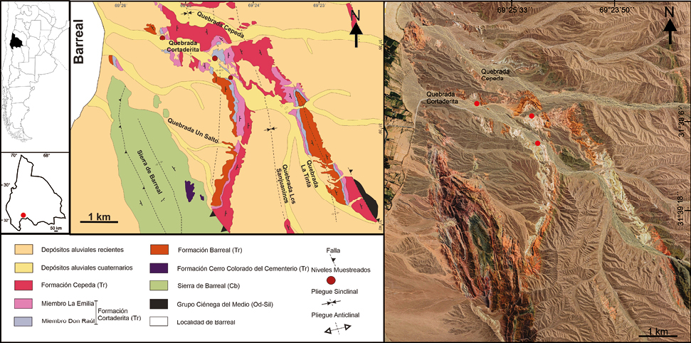 Los ejemplares analizados en esta contribución provienen de la Quebrada La Cortaderita, San Juan, Argentina, de los miembros litoestratigráficos de la Formación Cortaderita: Don Raúl (miembro inferior, de tonos grises) y La Emilia (miembro superior, de tonos rosados), de acuerdo con la propuesta de Bodnar et al. (2019) (Figura 1). La sección inferior gris está dominada por limolitas y areniscas limosas grises bentoníticas, mientras que la sección superior rosada se caracteriza por la predominancia de areniscas finas a gruesas y sabulíticas rosadas y rojizas (Bodnar et al. 2019).