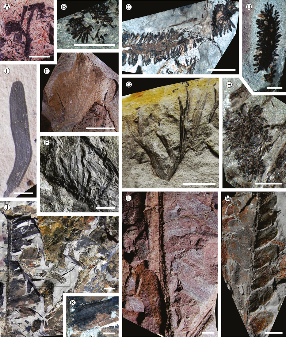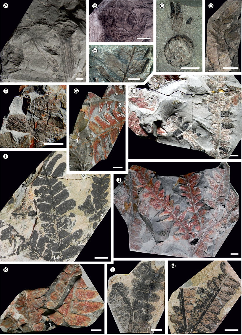 Figura 2. Aspecto general de eje vegetativo: A-C, Equisetites quimdecimdentata. Aspecto general de las frondes: D-E, Cladophlebis mendozaensis. F-G1, Dicroidium argenteum. G2-H-I1-J; K1 D. lancifolium. K2, L, M, D. odontopteroides. A-B: CTES PB 362a-b, C: CTES PB 359a, D: CTES PB 359b, E: CTES PB 360a, F: CTES PB 315a, G: CTES PB 341, H: CTES PB 318, I: CTES PB 310, J: CTES PB 312, K: CTES PB 311, L: CTES PB 354, M: CTES PB 293. Escalas= 10 mm, excepto B, C, E=5 mm.