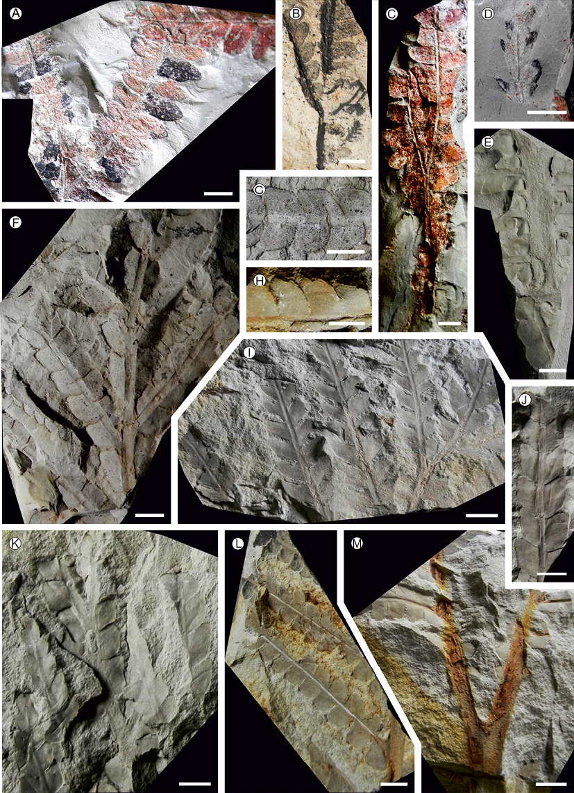 Figura 3. Aspecto general de las frondes: A-C, Dicroidium odontopteroides. D, D. stelzneriana. E-M, Zuberia papillata (E, K, M: parte basal, con raquis bifurcado; I: parte apical de la fronde; L: parte media; G, H, J, M: detalle de la forma de las pínnulas). A: CTES PB 331, B: CTES PB 353a, C: CTES PB 300, D: CTES PB 323c, E: CTES PB 280, F: CTES PB 269a, G: CTES PB 269a, H: CTES PB 261b, I: CTES PB 285a, J: CTES PB 274b, K: CTES PB 275, L: CTES PB 261a, M: CTES PB 285b. Escalas=10 mm.