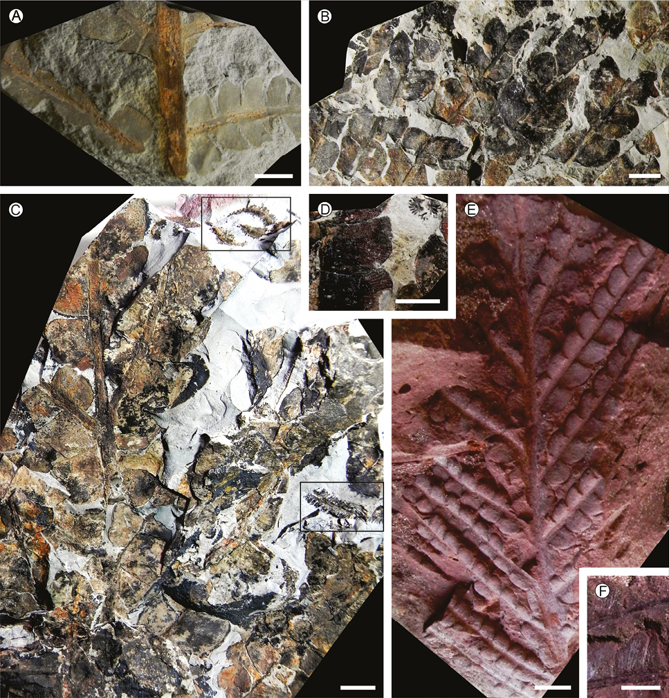 Figura 4. Aspecto general de las frondes: A, Zuberia papillata. B-D, Zuberia feistmantelii, detalle de pinnas y forma de las pínnulas; los rectángulos resaltan a Pteruchus barrealensis. D, forma pínnula y sección transversal de Pteruchus barrealensis. E-F, Zuberia zuberi. F, detalle de pinnas y forma de las pínnulas. A: CTES PB 263, B: CTES PB 369, C: CTES PB 378, D: CTES PB 382a-b, E: CTES PB 385, F: CTES PB 389. Escalas=10 mm, excepto F= 5mm.