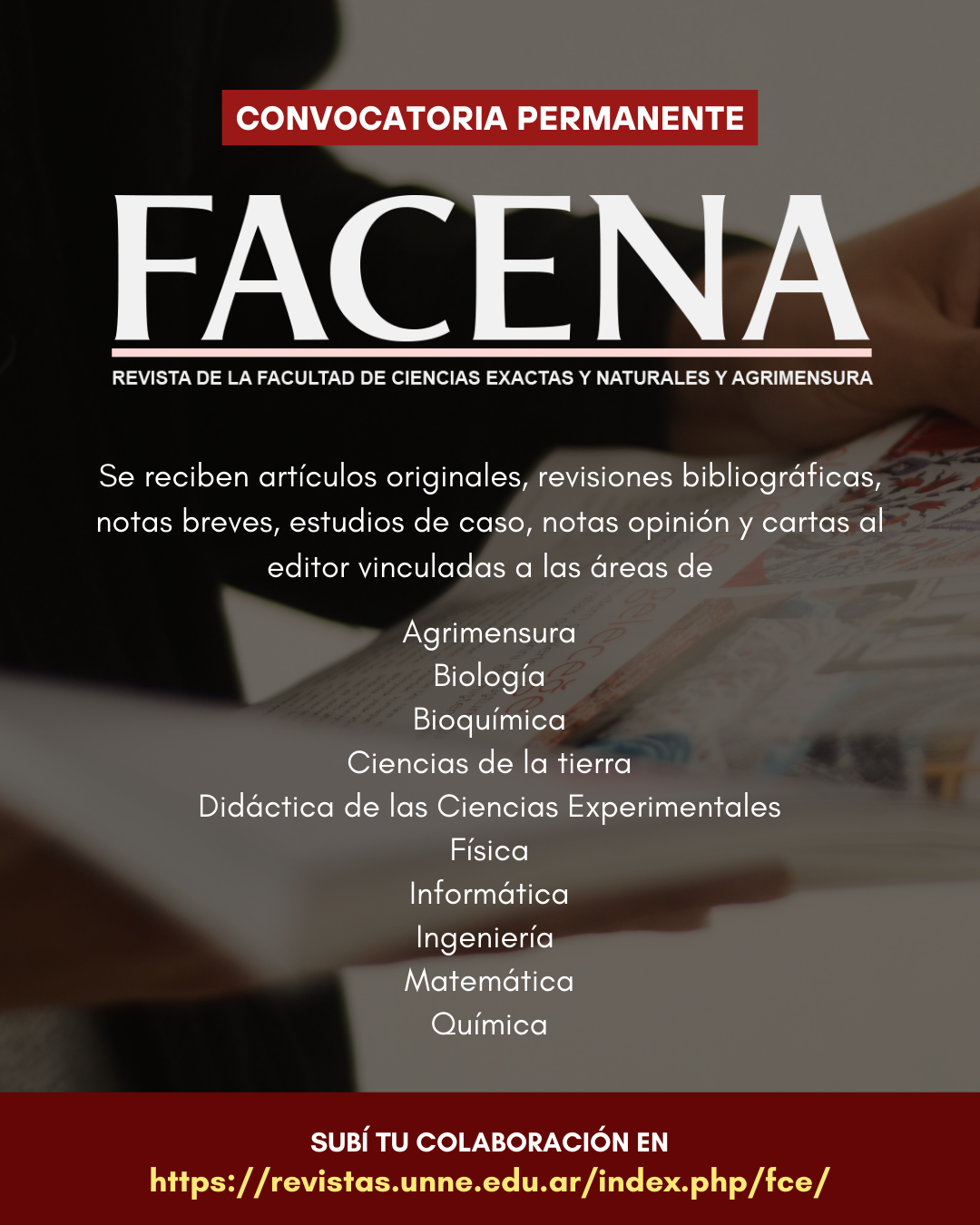 FACENA es la revista científica de la Facultad de Ciencias Exactas y Naturales y Agrimensura de la Universidad Nacional del Nordeste. Desde el año 1977, publica artículos originales que representan una contribución para el desarrollo científico tecnológico e incluye trabajos de investigación básica y aplicada y de desarrollo tecnológico, además de revisiones bibliográficas, comunicaciones breves y cartas al editor. Las áreas de incumbencia de la revista son: