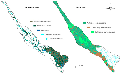 De acuerdo con la zonificación ambiental y el análisis de ocupación del suelo de la cuenca, se puede verificar que los bosques son los ecosistemas naturales más representativos, seguidos por los morichales, los humedales y los caños como sistemas lóticos. En cuanto a ecosistemas transformados, los usos agrícolas y pecuarios del suelo muestran un evidente predominio frente a los ecosistemas naturales, pero las proporciones con las que se relacionan entre sí en cuanto a área ocupada, varía en las porciones alta, media y baja de la cuenca. Es necesario acotar, además, que las presiones impuestas por el avance de actividades antrópicas se han venido traduciendo en fragmentaciones localizadas del bosque de galería (Figura 4).