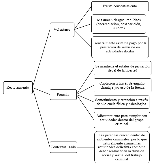 El Observatorio Nacional de Prevención del Reclutamiento de Niñas, Niños y Adolescentes por Parte de la Delincuencia Organizada (ONPRENNA) define el reclutamiento como un proceso continuo de incorporación a estructuras criminales para la realización de actividades ilícitas, a través de mecanismos como la sustracción, captación, amenaza, intimidación, rapto, engaño, uso de la fuerza, coacción o promesas de pago y beneficios, entre otros (ONPRENNA, s. f.). Este organismo distingue entre reclutamiento forzado y no forzado; sin embargo, dicha clasificación resulta ambigua, ya que considera “no forzado” aquel que ocurre sin mediar violencia directa, lo cual omite las múltiples formas de coerción estructural, económica y simbólica que también condicionan la participación en el crimen organizado. Es decir, la ausencia de violencia física no exime el estatus de “forzado” en el reclutamiento. Además, organismos como Global Protection Cluster (s.f.) señalan que el reclutamiento se considera siempre forzoso si la víctima es menor de edad, debido a la imposibilidad de que un menos dé su consentimiento libre e informado.