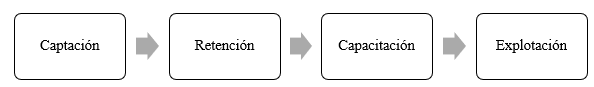 En ese sentido, es necesario analizar el reclutamiento forzado como un proceso que consta de diferentes etapas: captación, retención, preparación y explotación (figura 2). La captación hace referencia a las formas y mecanismos para reclutar, por ejemplo: engaños de ofertas laborales, amenazas, secuestro, etcétera. Puede ser que en esta etapa no se utilice la violencia física, pero si otros tipos de violencias como la psicológica (amenazas y chantajes).