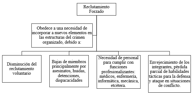 El reclutamiento forzado puede entenderse como un proceso estructurado y continuo mediante el cual las organizaciones criminales incorporan, retienen, adiestran y explotan a personas mediante mecanismos de coerción y sometimiento. Este proceso comprende cuatro etapas interrelacionadas: la captación, orientada a atraer o engañar a las víctimas; la retención, que busca impedir su negativa o escape mediante amenazas y control; la preparación, centrada en el adiestramiento y aprovechamiento instrumental de sus capacidades; y la explotación, que constituye el objetivo final, al utilizar a las personas reclutadas como recursos funcionales para las operaciones delictivas.