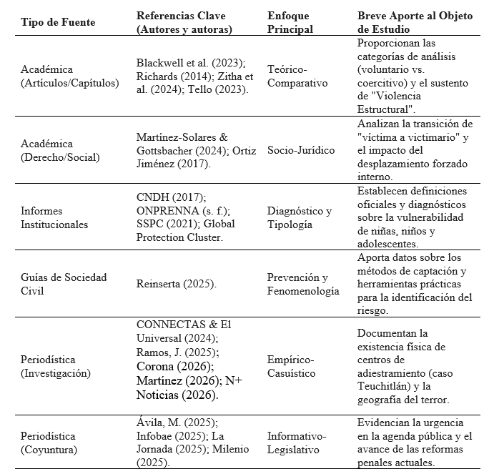 Debido a que el reclutamiento forzado se constituye como un objeto de estudio emergente en el contexto mexicano, la estrategia de selección no se restringió mediante criterios rígidos de exclusión. Por el contrario, se optó por un enfoque de muestreo no probabilístico, intencional y acumulativo (Hernández, 2021), asumiendo que la dispersión de los documentos existentes es, en sí misma, un indicador de la complejidad del fenómeno. Bajo esta lógica, cada material recolectado fue categorizado según su dimensión predominante (teórica, metodológica, social, jurídica o legislativa), permitiendo que la integración de estas diversas narrativas y datos brinde una estructura sólida a las coordenadas conceptuales que definen el problema (Tabla1).