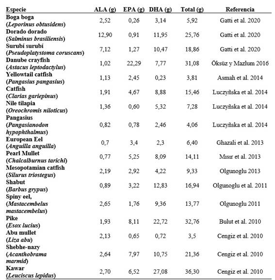 Es importante destacar que todas las especies de peces contienen ácidos grasos EPA y DHA y que sus concentraciones pueden variar significativamente entre especies e incluso dentro de una misma especie según factores ambientales y dietarios (Querques et al. 2011, Mahaffey et al. 2012). La literatura consultada en esta revisión permite para su mejor comprensión evaluar el contenido de ω3 (ALA, EPA, DHA y total) diferenciando especies de agua dulce y salada, que se esquematizan en las Tablas 1 y 2.