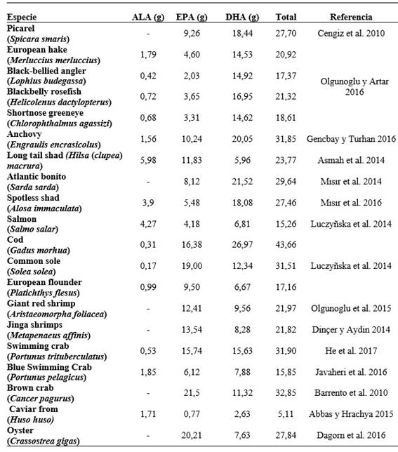 Sin embargo, las concentraciones de ω3 PUFA varían significativamente entre especies e incluso dentro de la misma especie (Olgunoglu 2017). Estas variaciones están determinadas por factores: 1) Bióticos (género, especie, edad, estado fisiológico, tipo de alimentación, cantidad de grasa muscular) y 2) Abióticos (clima, hábitat, técnicas de manipulación, conservación, procesamiento y cocción) (Ghaddar y Saoud 2012).