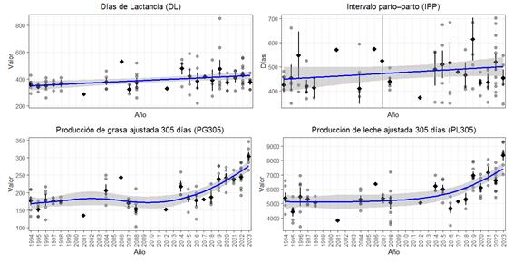 Las variables productivas (PG305 y PL305) muestran incrementos sostenidos a lo largo del período, mientras que DL evidencia un aumento moderado y el IPP se mantiene relativamente estable en el tiempo con valores altos (478,5 ± 124) días. La Figura 2 resume la evolución conjunta de los principales rasgos productivos y reproductivos en un mismo formato.