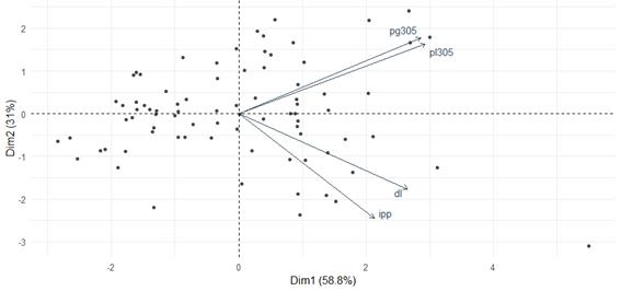 Estructura multivariada de los rasgos. El análisis de correlaciones de Pearson mostró una asociación muy fuerte entre PL305 y PG305 (r = 0,881; p<0,001). DL presentó correlaciones moderadas con PL305 (r = 0,46; p<0,001) y PG305 (r = 0,42; p<0,001), y una asociación fuerte con IPP (r = 0,68; p<0,001). En contraste, las correlaciones entre IPP y los rasgos productivos fueron débiles, lo que indica una independencia relativa entre las dimensiones productiva y reproductiva.