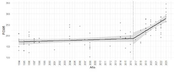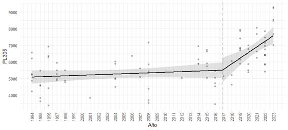Al igual que PL305, PG305 presentó un punto de quiebre cercano a 2017, consistente con un cambio en el sistema pastoril que alteró la tasa de incremento productivo.