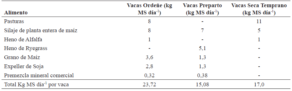 El sistema utilizado, es representativo de los establecimientos lecheros de la cuenca lechera sur de la provincia de Santa Fe (Bargo et al. 2009). El mismo corresponde a un sistema de base a pastoreo (pasturas implantadas a base de alfalfa (Medicago sativa), avena (Avena sativa), raigrás (Lolium multiflorum), ocupando entre el 40 al 50% de la dieta) con distintos regímenes de suplementación durante el año (grano partido de maíz, rollo de alfalfa y ensilaje de maíz y de sorgo, alimento balanceado comercial y subproductos de la industria aceitera), los cuales se expresan en valores absolutos en la Tabla 1.