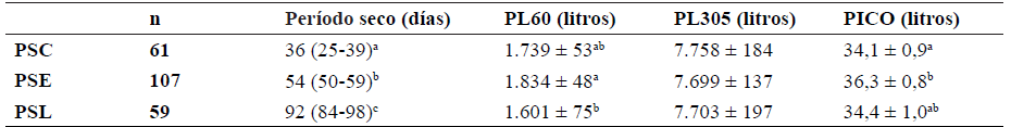 La producción de leche a 60 días en lactancia mostró una diferencia (p = 0,02) en 233 litros entre PSE y PSL (Tabla 2) y sin diferencia entre PSE y PSC (p = 0,14). Analizando el pico de lactancia, las vacas con periodo seco PSE produjeron dos litros más que PSC (p = 0,03) y PSL (p = 0,11). La producción a 305 días en lactancia fue similar entre los grupos, sin observar diferencias significativas.