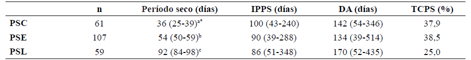Los resultados reproductivos observados en la Tabla 4, indican que no hubo efecto de la duración del periodo seco sobre las variables analizadas, si bien el grupo PSL tuvo los valores más alejados en TCPS y DA no mostró diferencias con el resto de los grupos.